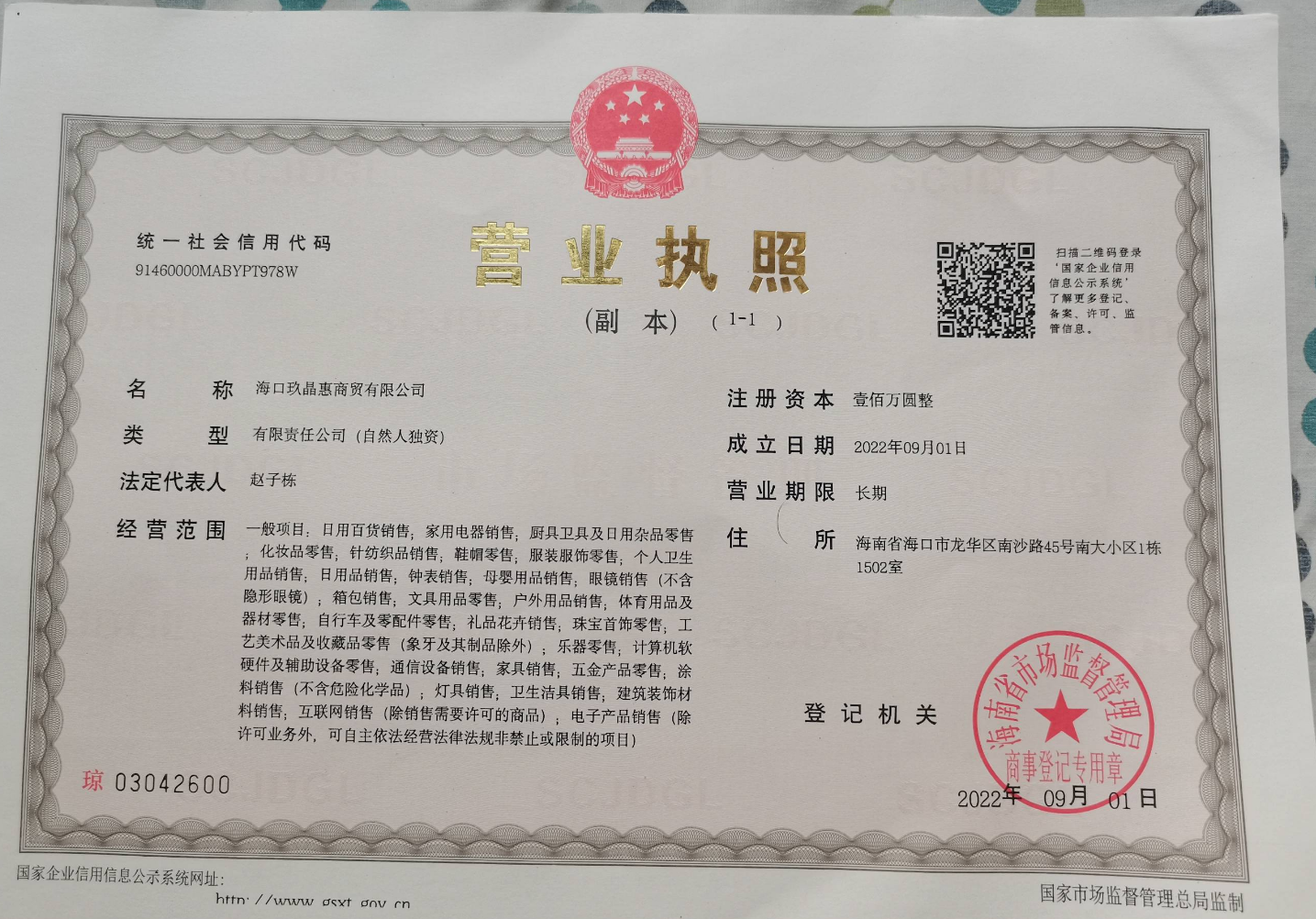Cégnév: Haikou Jiujinghui Trading Co., Ltd.